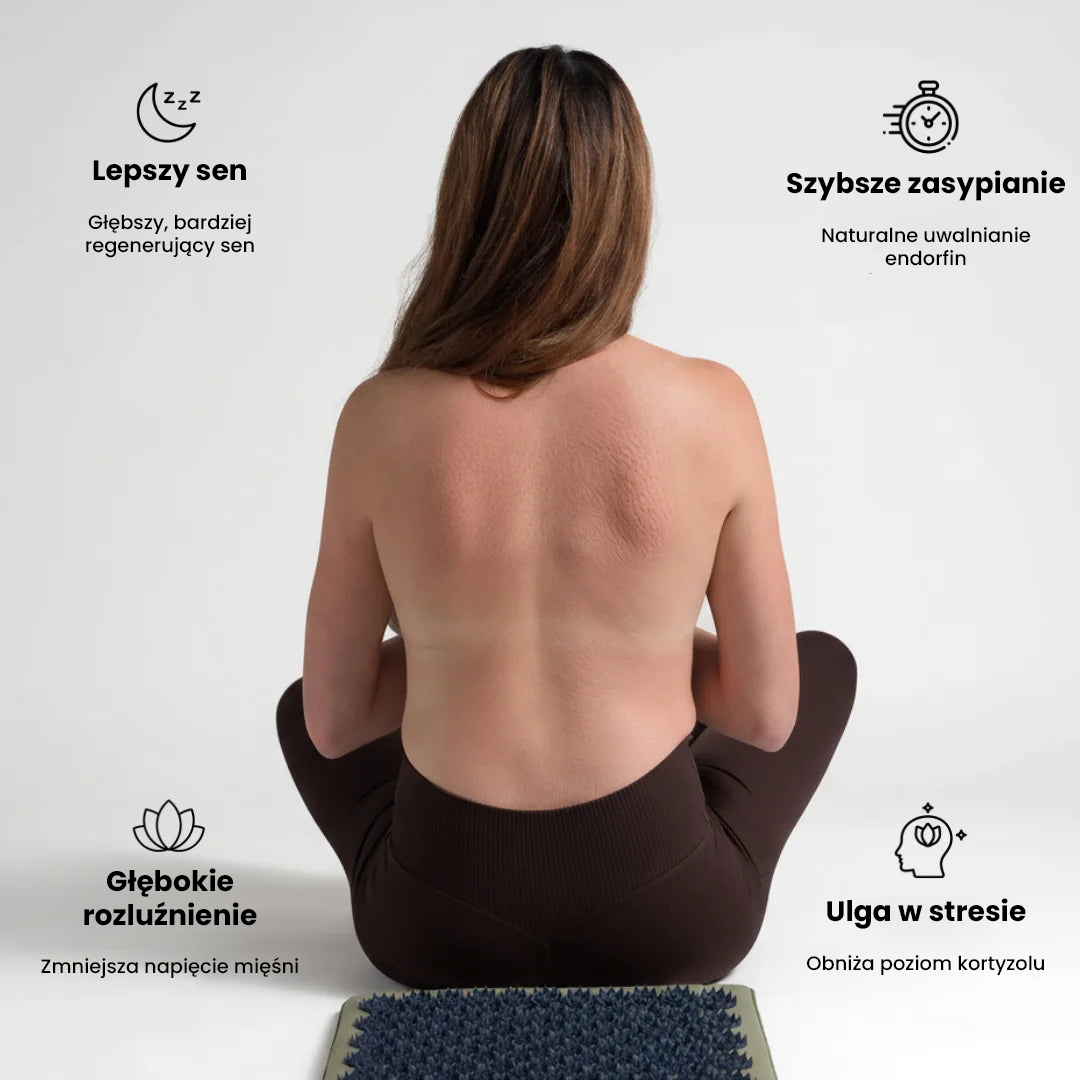Punktowy nacisk poprawia krążenie i rozluźnia spięte mięśnie. Dzięki temu mata może zmniejszać dyskomfort związany z napięciem mięśni, bólami głowy, pleców czy karku, a także przewlekłym bólem wynikającym ze stresu.